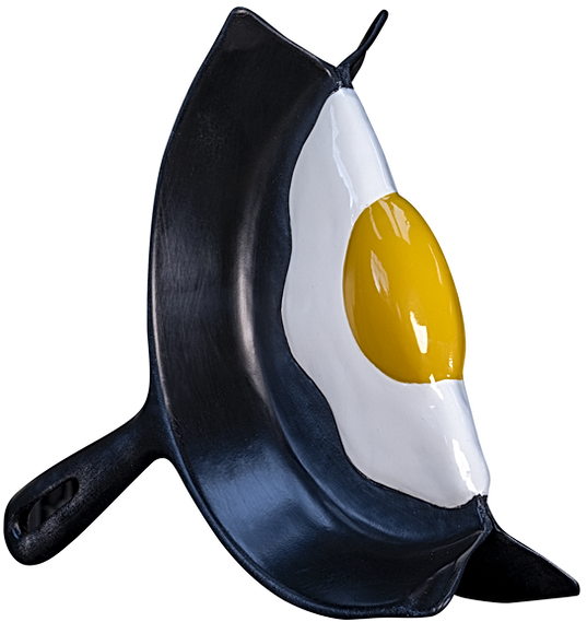 When I imagined L'Œuf Français, my desire was to capture the mirror effect of our own existence. The egg sculpted on a cast-iron pan and folded in on itself reflects our inner duality. The thin line that divides it in two evokes an invisible frontier that separates us from ourselves, fragile but essential to our transformation. Perhaps the mystery of the Big Bang lies in this line, on the edge of unity and fragmentation. It is no longer man's hand that maintains this delicate balance, but an invisible force, suspended in infinity, that echoes the whole.
